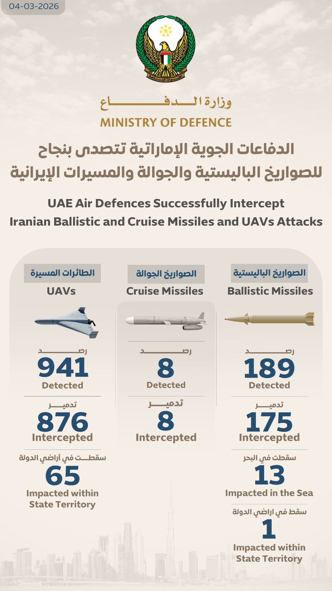 [GEOPOLITICA] Le difese aeree degli Emirati Arabi Uniti hanno intercettato con successo missili balistici e da crociera iraniani e UAV